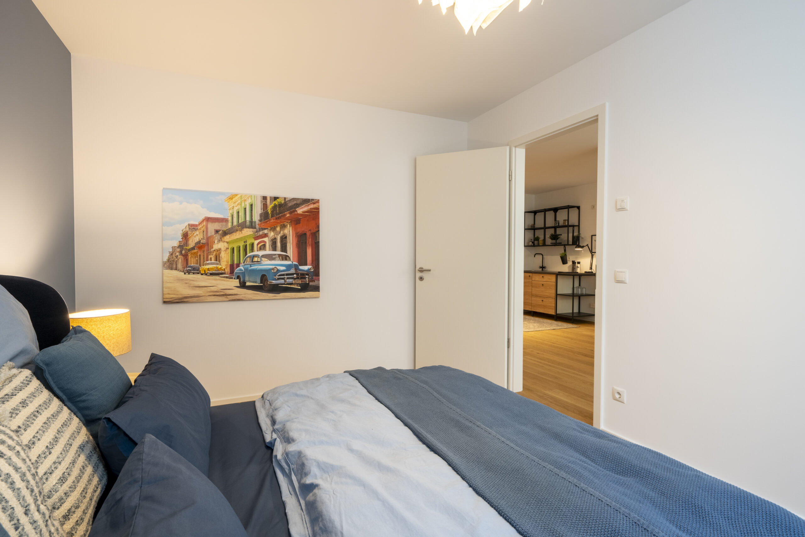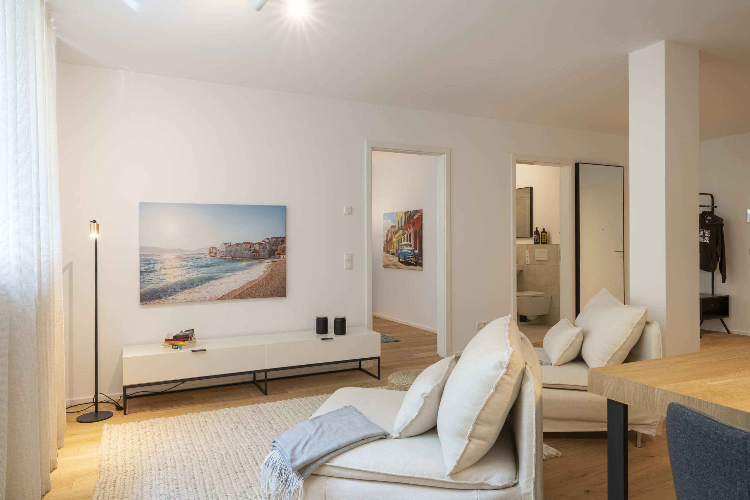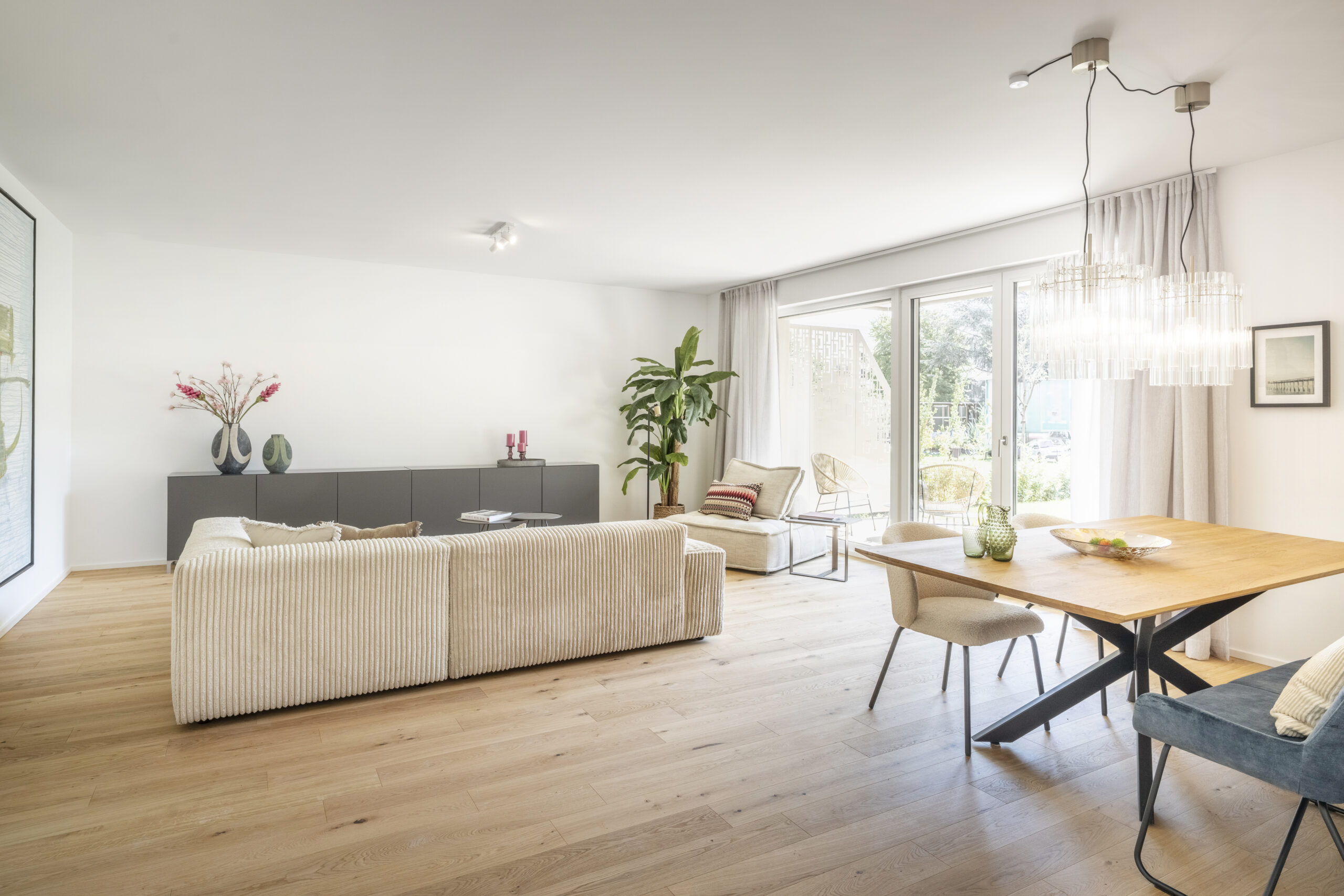 Bedürfnissen – individuell genutzt werden: ob als 6-Zimmer-Wohnung auf zwei Ebenen oder als 4-Zimmer-Gartenwohnung mit 2-Zimmer-Einliegerwohnung. Das Erdgeschoss verfügt über eine Wohnfläche von rund 123 m². Im EG befinden sich drei Schlafzimmer, darunter das großzügige Eltern-Schlafzimmer. Letzteres verfügt über ein elegantes Tageslicht-Ensuite-Bad mit Dusche. Das zweite Badezimmer ist mit einer Wanne ausgestattet. Der Wohn- und Essbereich ist offen gestaltet und schließt sich an die Küche an. Bodentiefe Fenster sorgen dabei für viel Licht im Wohnbereich. Praktischen Stauraum bietet der Keller sowie ein großer Abstellraum mit Waschmaschinen-Anschluss im Souterrain.